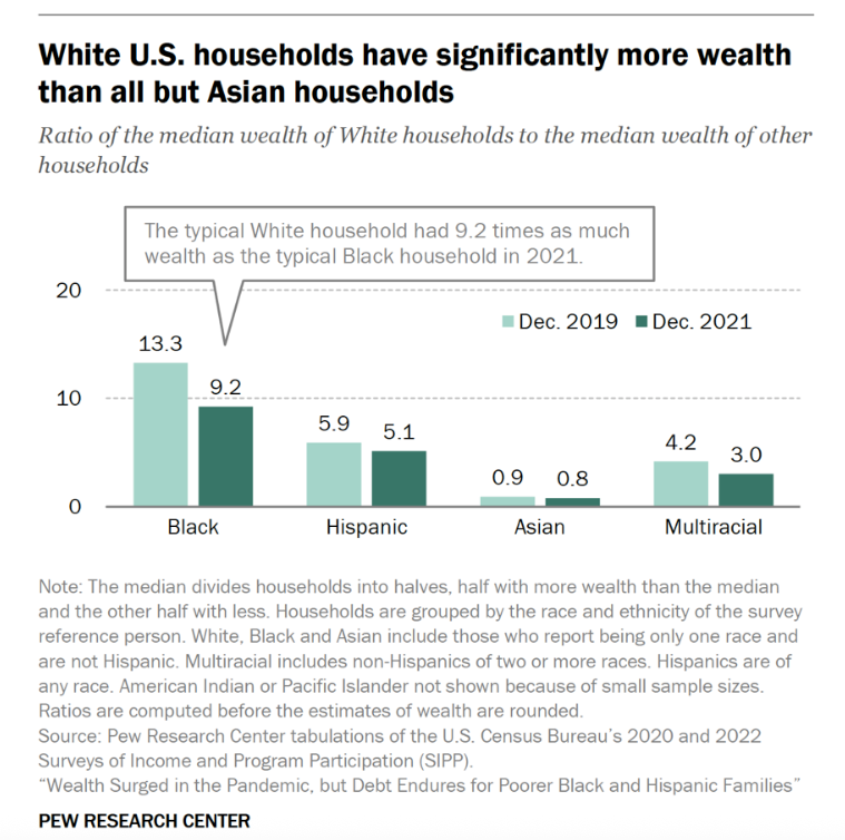 But, to be honest, I have a soft spot for my community. Regarding household wealth, Hispanics have only a median net worth of $48,700; white ($250,400) and Asian ($320,900) households have a much larger median wealth.